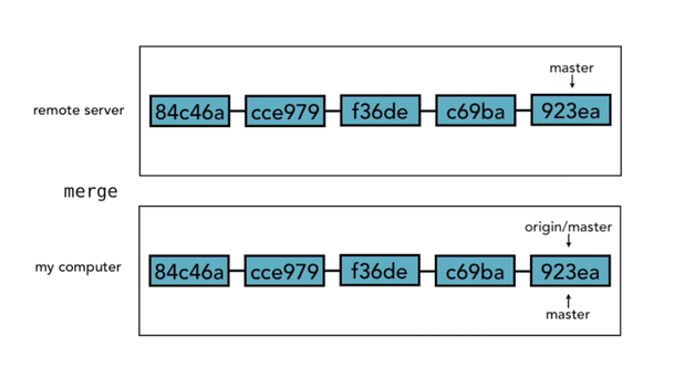 And when we merge git will move the head pointer of the master to the head pointer for the origin/master.