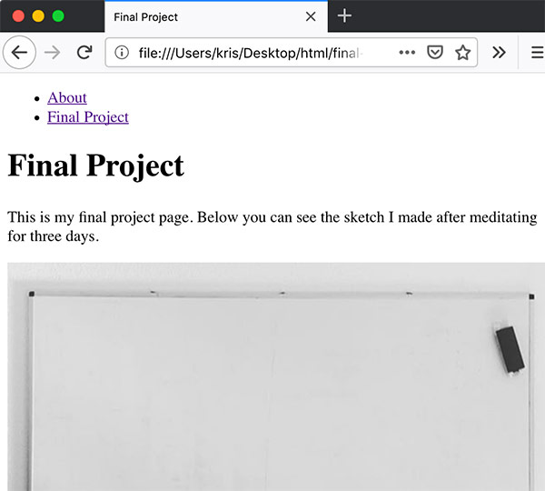 What you will notice after you click on the link is that there is no way to go back! In order to fix that, we are going to improve the existing menu in index.html file and copy it over to the final-project.html.