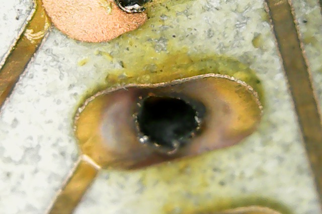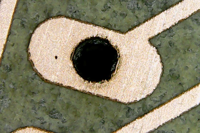 This happens when the holes are lasered on top or too close to the traces. As you can seen in the next picture, even with better settings you can get damaged holes:
