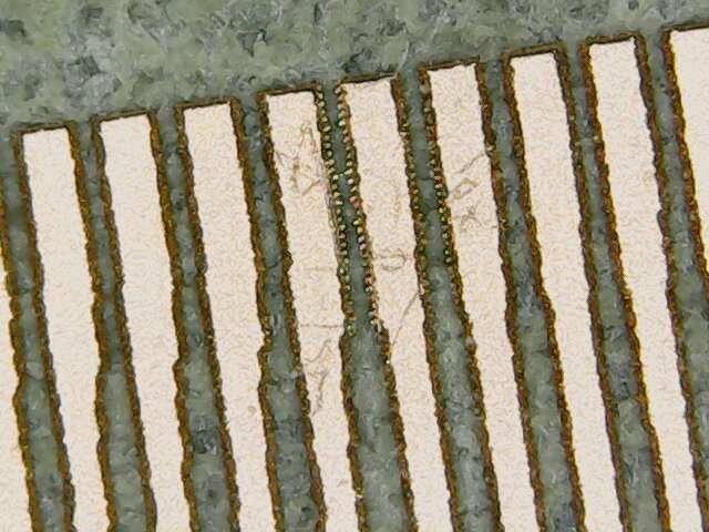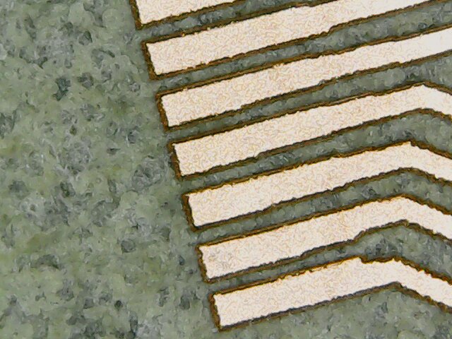 The first experimentations were done by Enrico Bassi who is the lab manager at Opendot. Enrico worked experimenting the basic settings for engraving the copper and the first tests for cutting the board. Using an USB microscope brought by another student, Simone Boasso, he was also able to see that we need to engrave the FR1 with a resolution of 1000 dpi, otherwise the traces will have rough borders: see the picture below taken by Enrico: